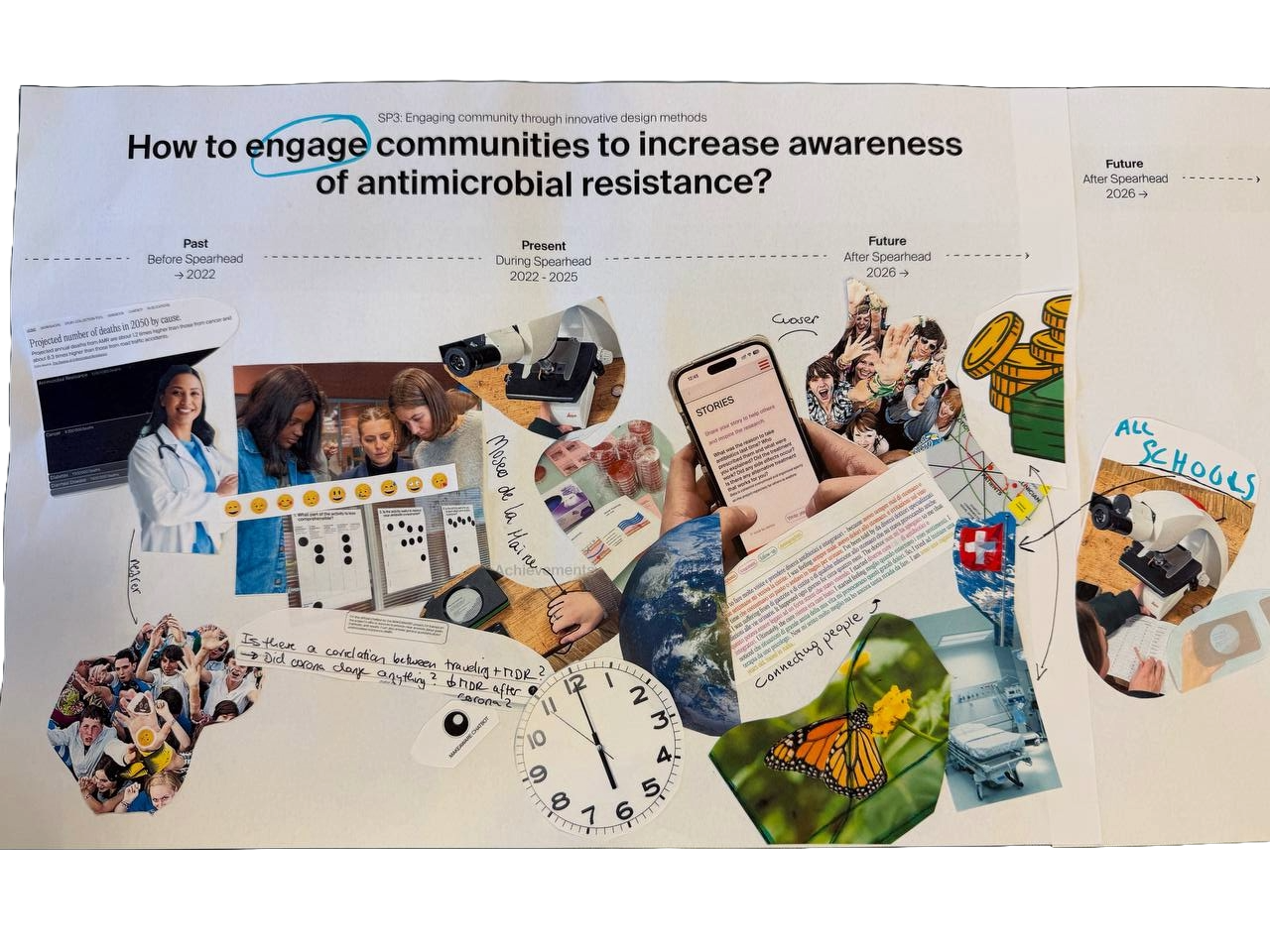 SPEARHEAD consortium members and external participants are invited to work together to reflect on four years of antimicrobial resistance research and to explore possible future research trajectories. Through collage and visual storytelling, participants translate experiences, achievements, and challenges into shared visual abstracts.
