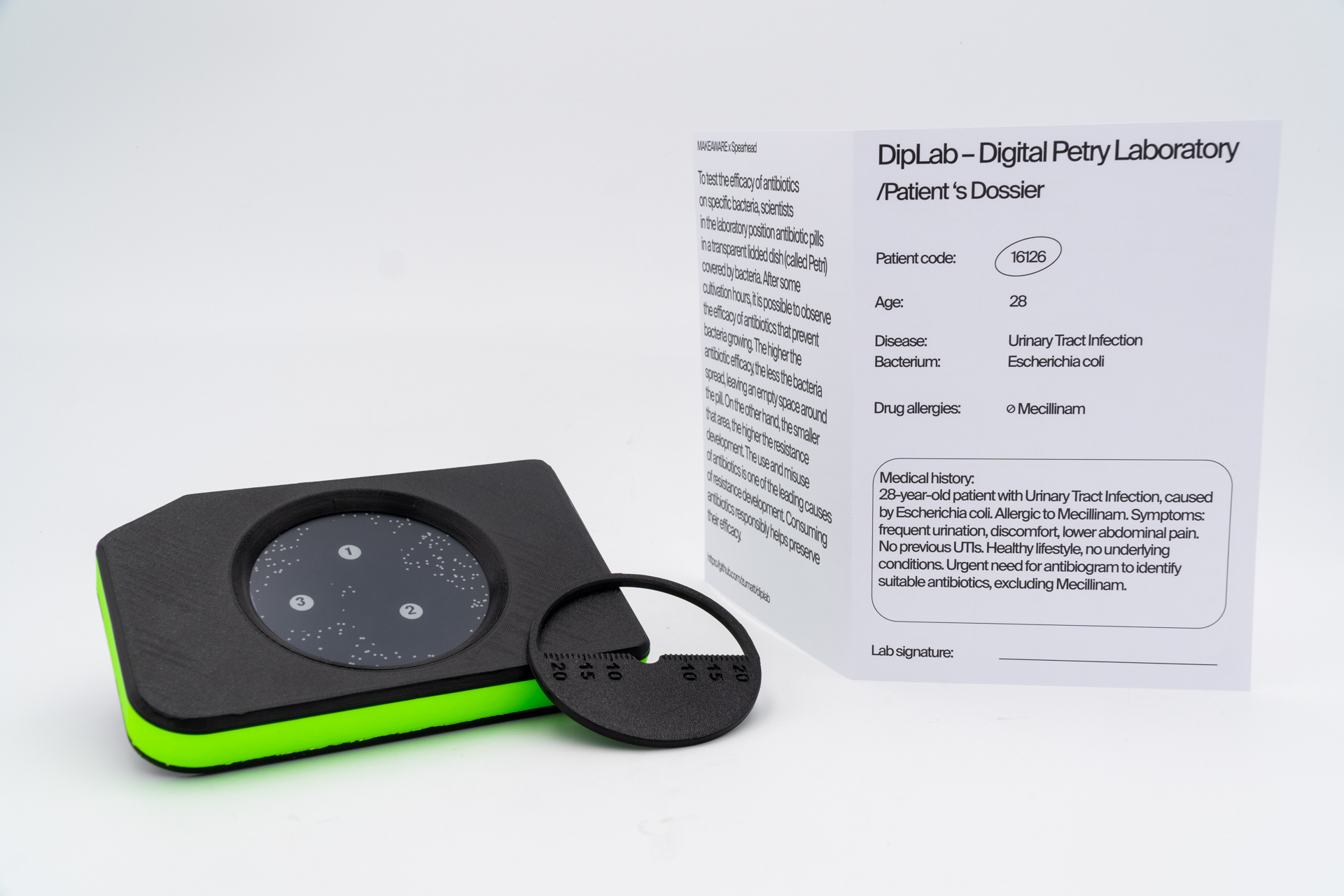 To engage high-school students in understanding antimicrobial resistance, DipLab translates the antibiogram test into a digital format. Through a handheld device, elements of laboratory practice are simulated, turning the steps of testing antibiotic susceptibility into an accessible learning activity.