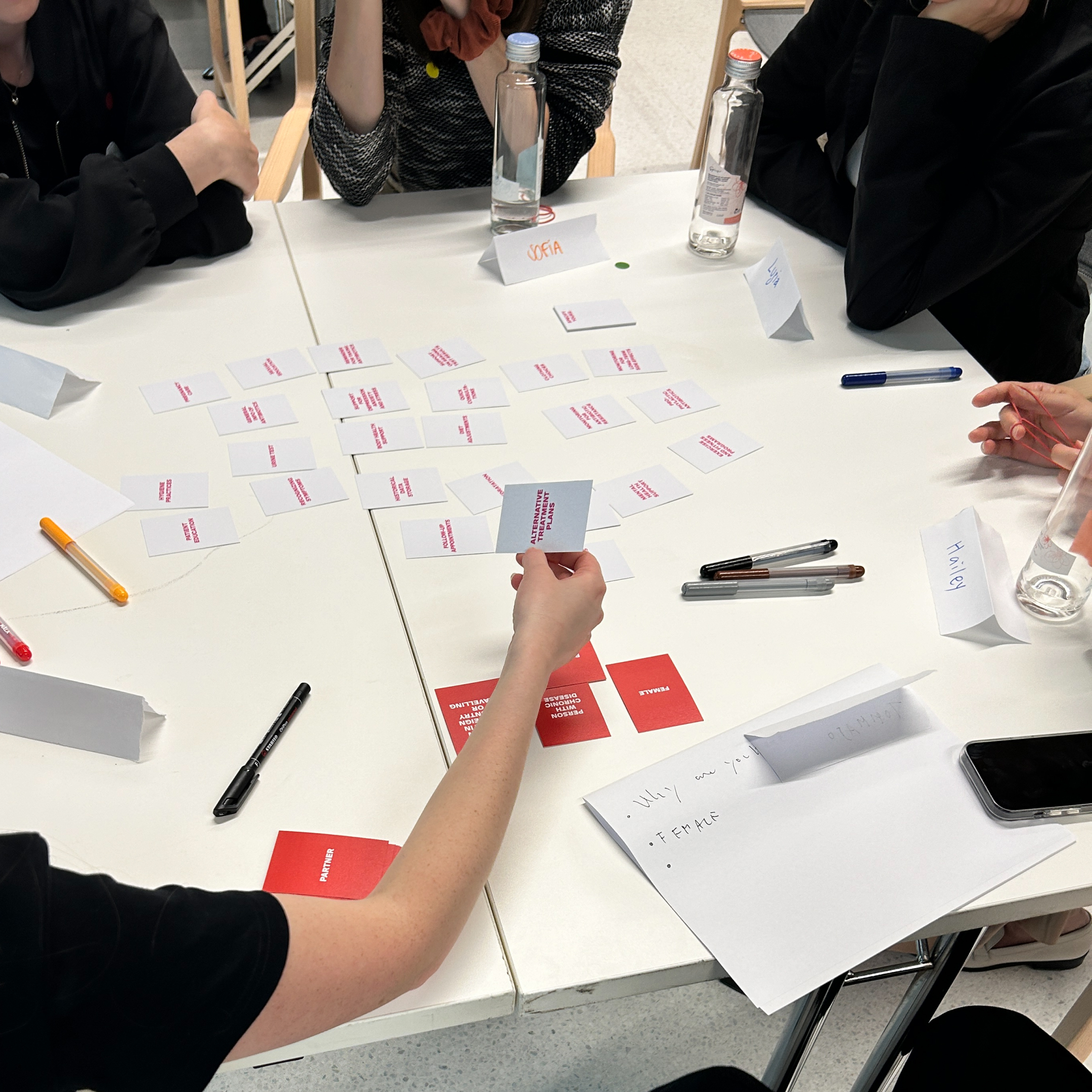 After an introduction to the project and research topic, participants engaged in a structured set of activities to design chatbot conversations addressing antibiotic-related issues. Working in groups, they used physical cards to explore patient profiles and scenarios. Each group first defined a specific patient type and needs, drawing on pre-made or customisable cards informed by real stories collected in previous workshops. A second set of role-based cards was then used to define the chatbot’s function in responding to those needs.