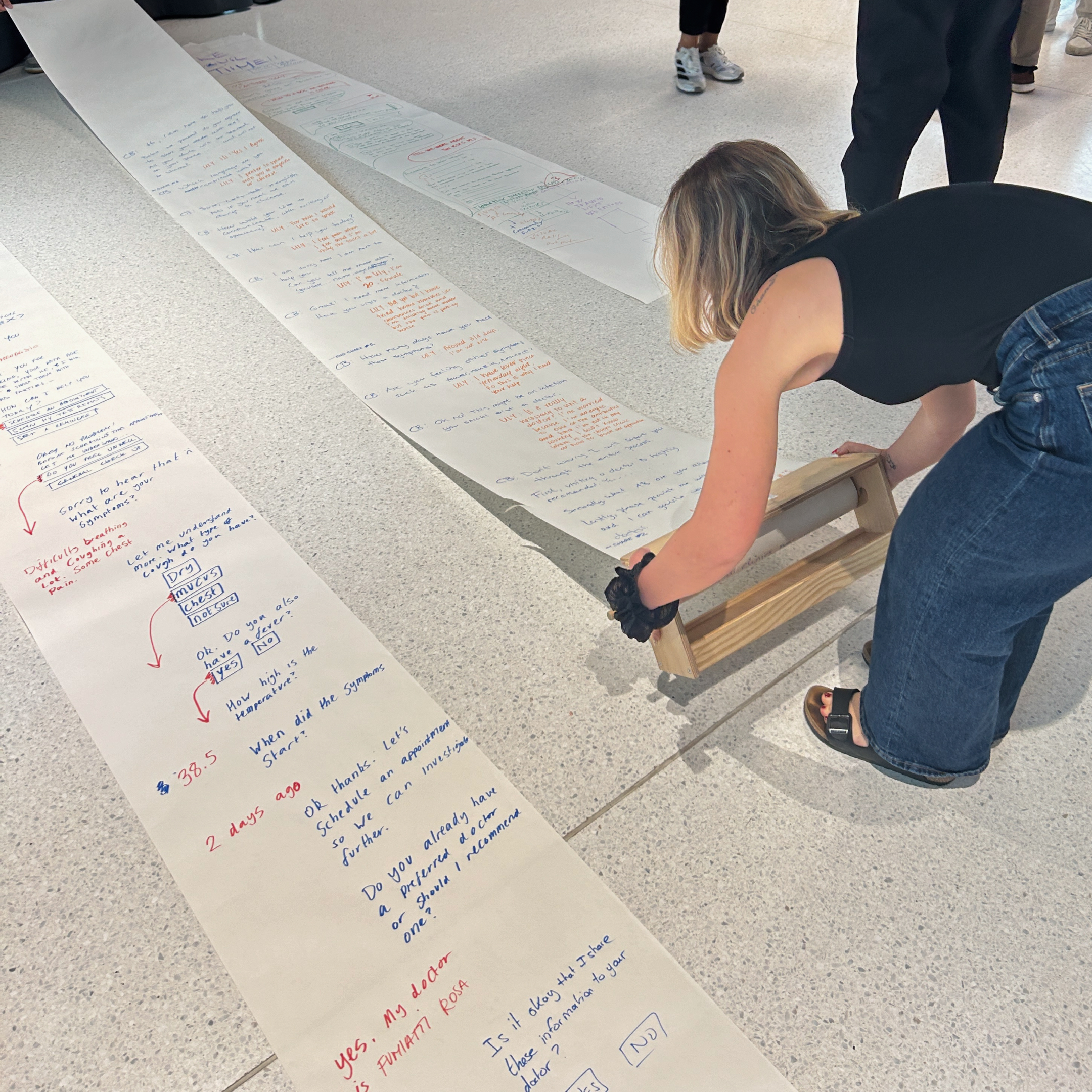 Using an A3 sheet, participants developed scenarios of chatbot–patient interaction, guided by prompts about the patient’s environment, emotions, goals, and constraints. They then sketched full conversations on a paper roll, including onboarding steps such as capabilities, consent, and data handling. Groups also considered how the chatbot should manage user inquiries, unexpected questions, rude behaviour, emotional support, mental health concerns, and urgent medical situations, while defining its personality, empathy level, and follow-up processes.
